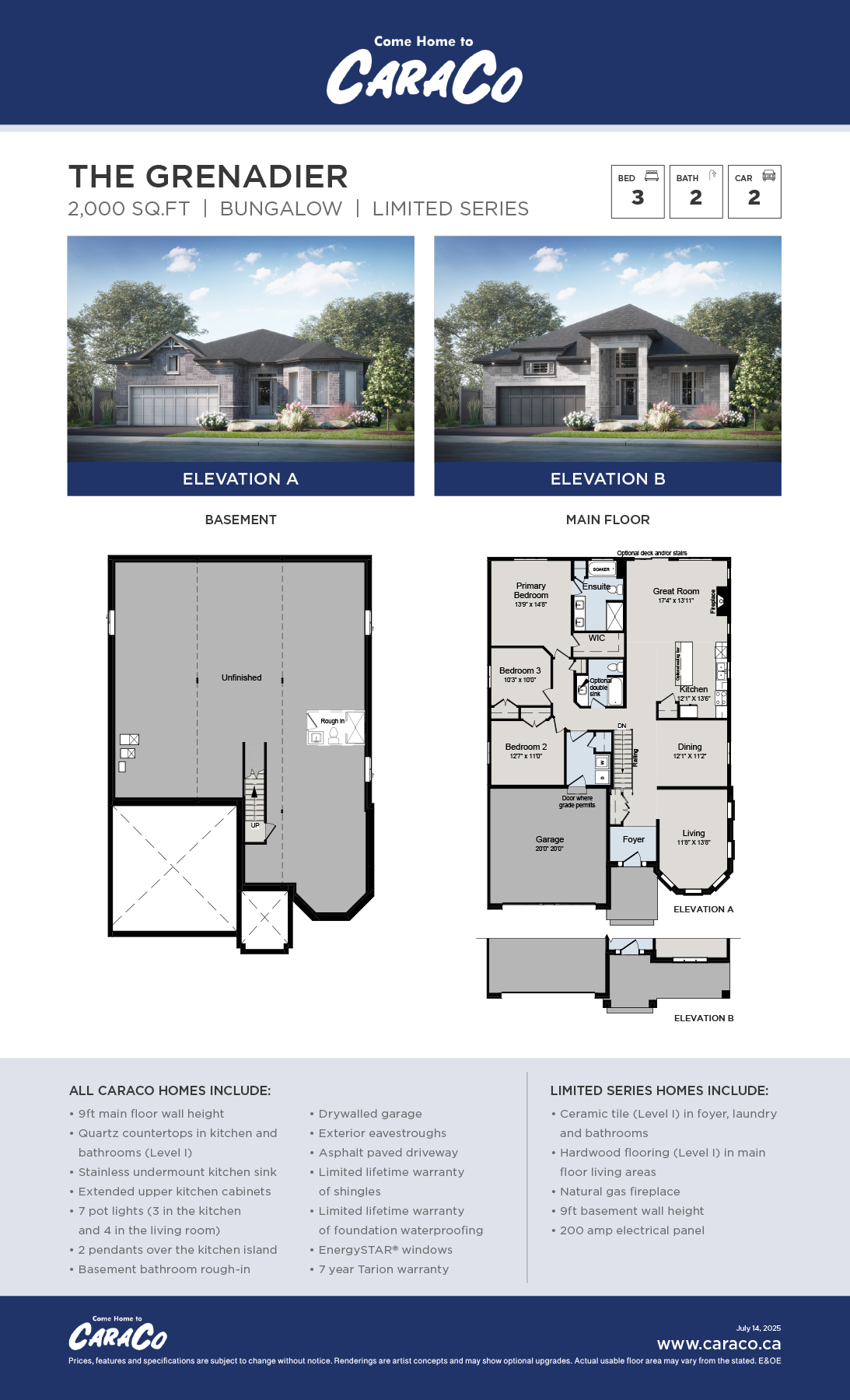 The Grenadier, an open concept bungalow featuring 2,000 sq/ft, 3 bedrooms and 2 bathrooms. Enjoy the oversized kitchen with ample counter-space and pantry, overlooking the great room. Formal dining room off the kitchen and separate living room. Convenient main floor laundry. The primary bedroom offers a walk-in closet and luxury 5-piece ensuite with soaker tub and tiled shower. The Grenadier from CaraCo, a well thought-out bungalow with just the right amount of space; make it your own with one of two available craftsman inspired exterior facades.