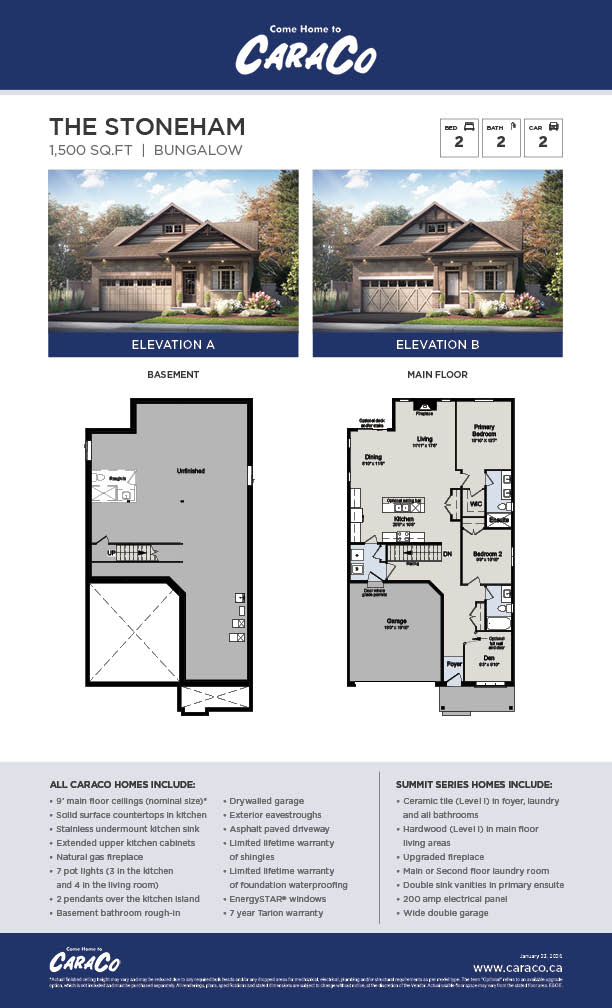 The Stoneham, an open concept bungalow featuring 1,500 sq/ft, 2 bedrooms, 2 baths and front den. Enjoy the oversized kitchen with pantry overlooking the living and dining rooms, plus a main floor den. Convenient main floor laundry and primary bedroom with walk-in closet and luxury 5-piece ensuite. A well thought-out bungalow with just the right amount of space; make it your own with one of two available craftsman inspired exterior facades.