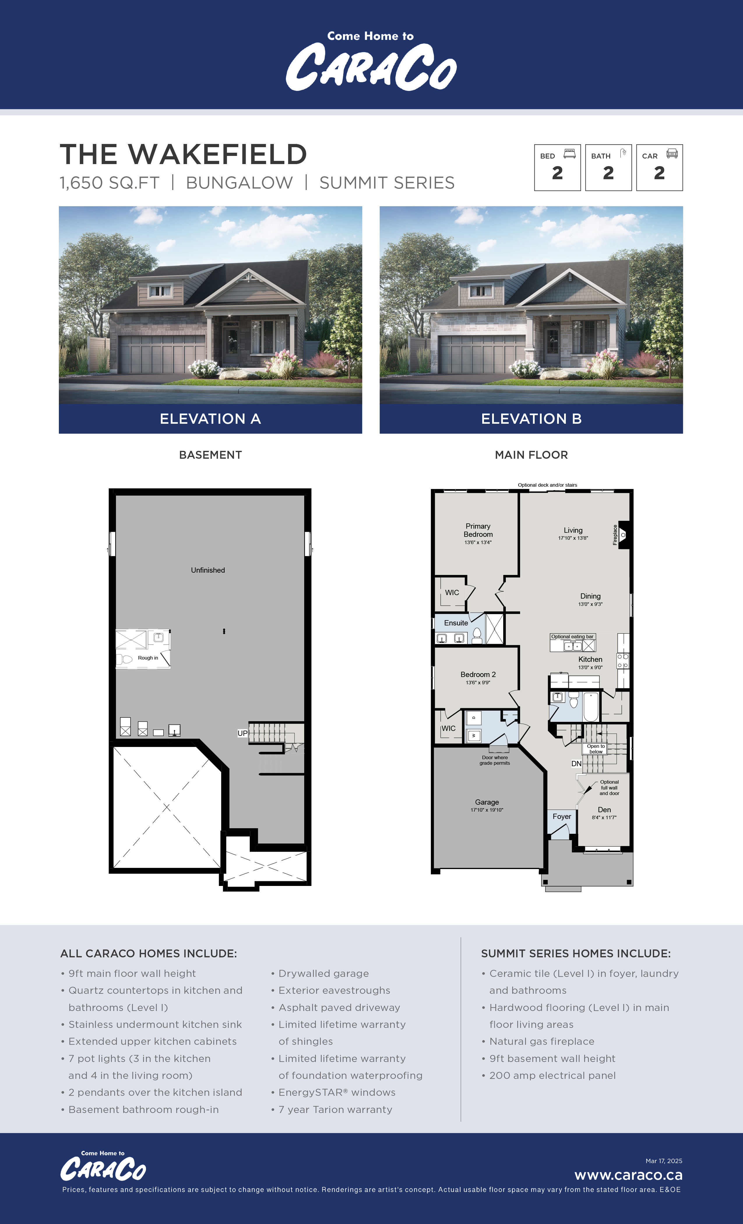 The Wakefield, an open concept bungalow featuring 1,650 sq/ft, 2 bedrooms, 2 baths and front den. Enjoy the oversized kitchen with walk-in pantry; overlooking the living and dining rooms, plus a main floor den. Convenient main floor laundry and primary bedroom with walk-in closet and luxury 5-piece ensuite. A well thought-out bungalow with just the right amount of space; make it your own with one of two available craftsman inspired exterior facades.