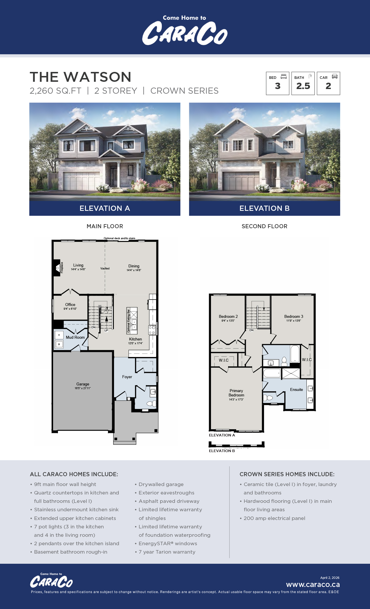 The Watson, an open concept two storey featuring 2,260 sq/ft, 3 bedrooms and 2.5 baths. Bright living room/dining room, plus den, adjacent to a spacious kitchen with ample counter space. Convenient main floor laundry/mud room and primary bedroom with walk-in closet and luxury 5-piece ensuite. A well thought-out two storey home with just the right amount of space; make it your own with one of two available craftsman inspired exterior facades.