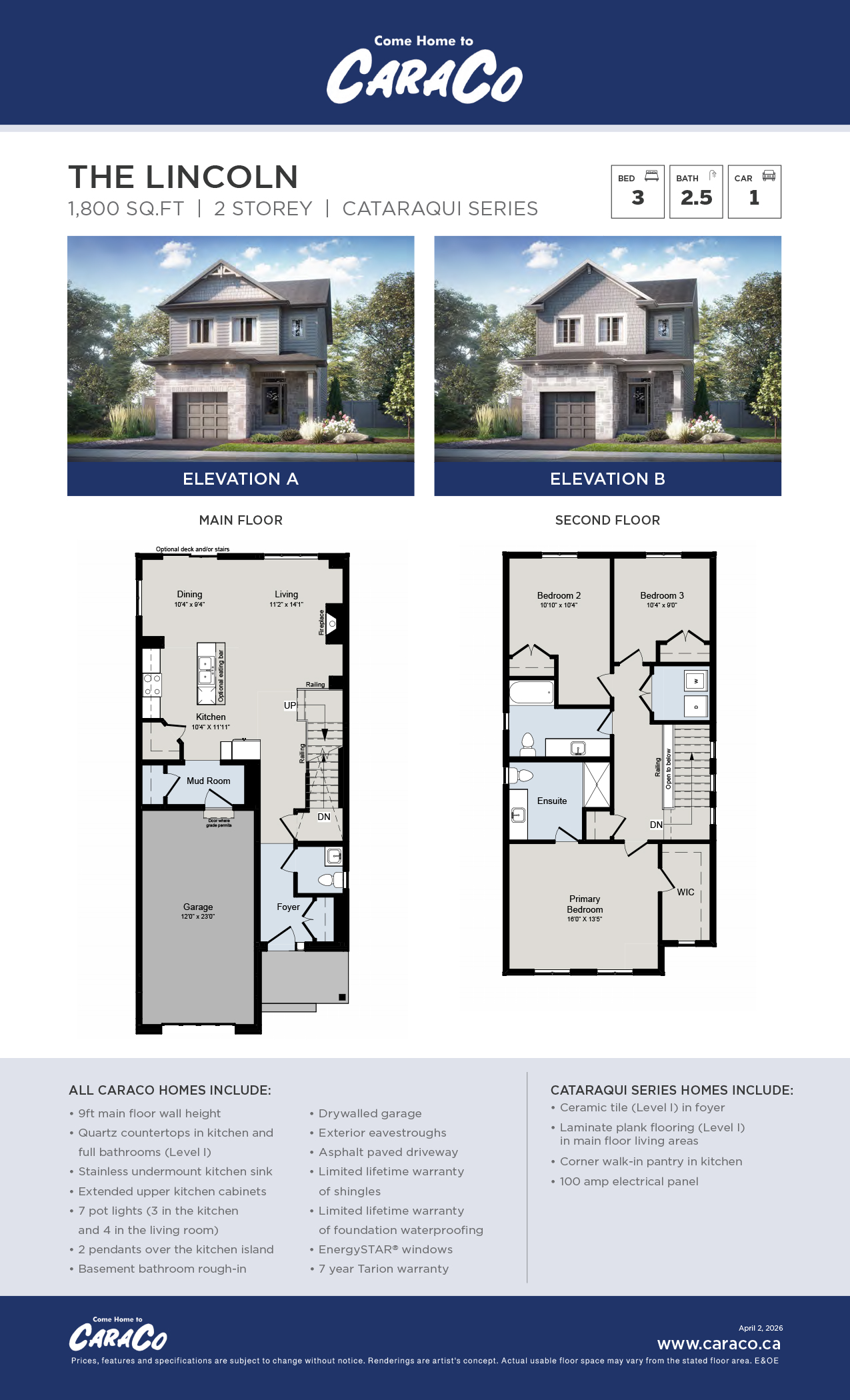 The Lincoln, an open concept two storey featuring 1,800 sq/ft, 3 bedrooms and 2.5 baths. Bright living room/dining room adjacent to the spacious kitchen with walk-in pantry. The second floor features the primary bedroom with large walk-in closet and 3-piece ensuite, as well as two additional bedrooms and second floor laundry room. A well thought-out two storey home with just the right amount of space; make it your own with one of two available craftsman inspired exterior facades.