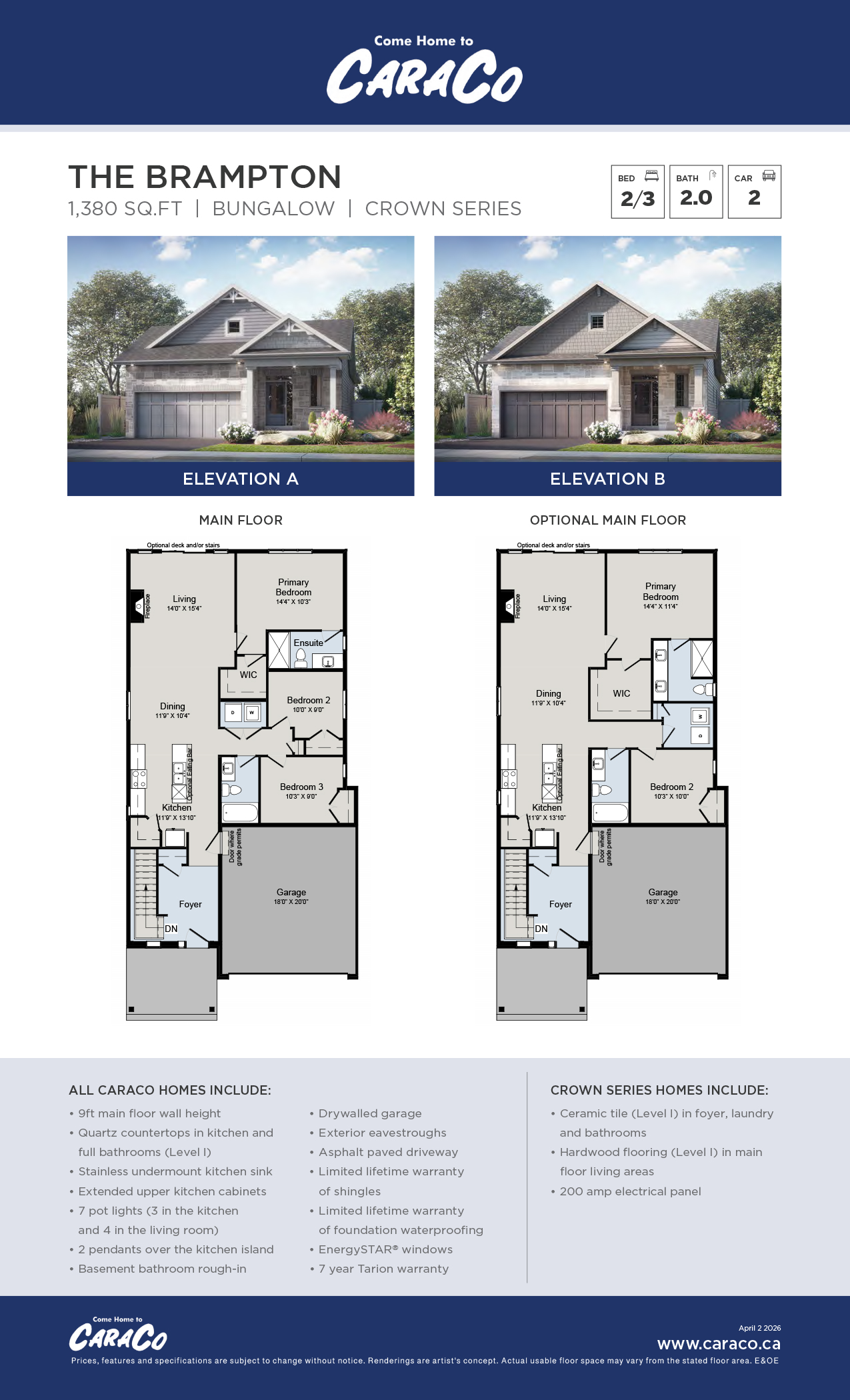 The Brampton, an open concept bungalow featuring 1,380 sq/ft, 2 or 3 bedrooms and 2 baths. Enjoy the spacious kitchen open to the living and dining rooms. Convenient main floor laundry and primary bedroom with walk-in closet and ensuite bathroom. A well thought-out bungalow with just the right amount of space; make it your own with one of two available craftsman inspired exterior facades.