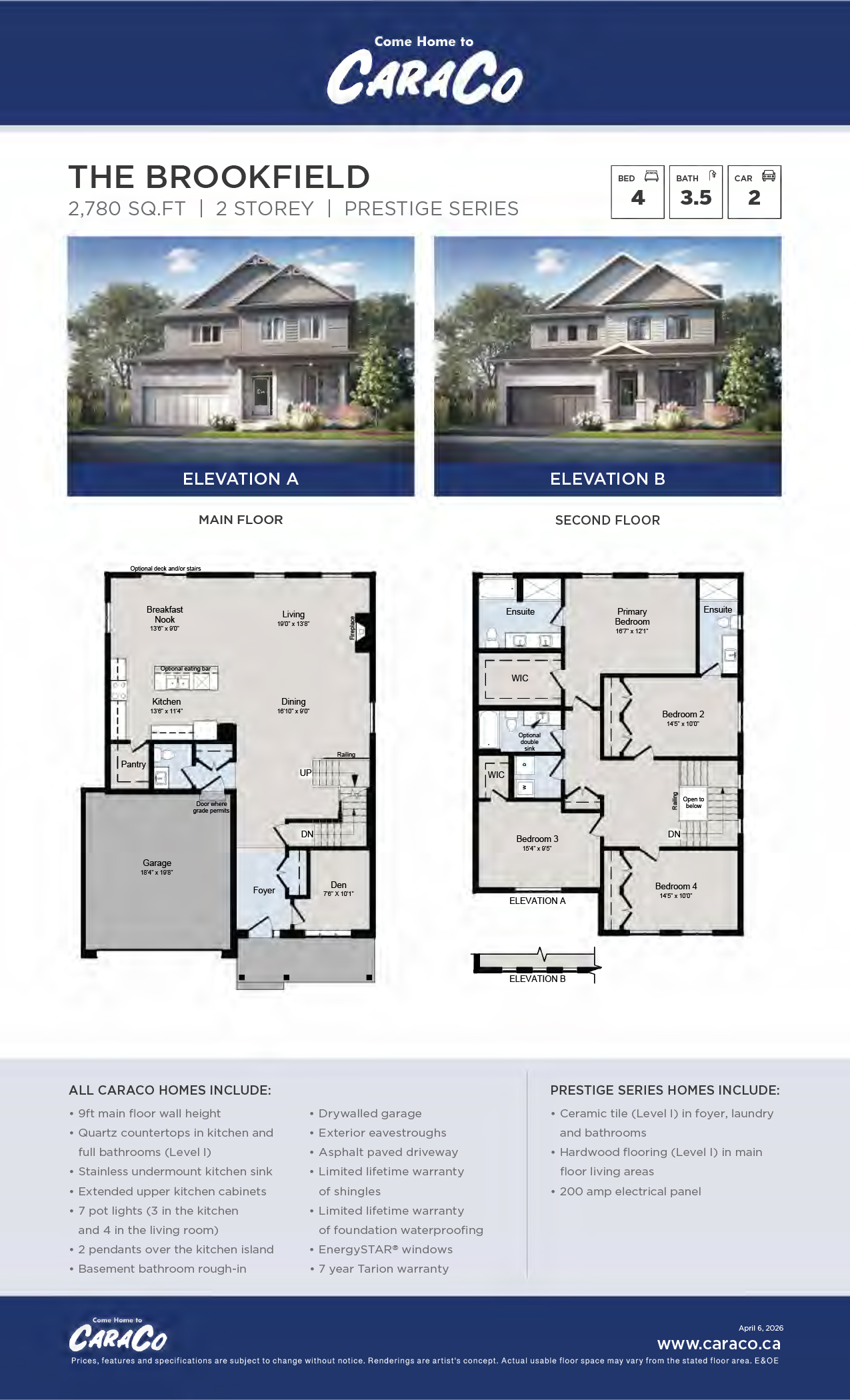 The Brookfield, an open concept two storey home offering 2,780 sq/ft, 4 bedrooms and 3.5 baths. The main floor features a bright living room with spacious kitchen with centre island, large walk-in pantry and adjacent to the breakfast nook. The main floor also features a large formal dining room and front office/den. The second floor offers 4 large bedrooms including the primary bedroom with oversized walk-in closet and luxury 5-piece ensuite complete with double sinks, tiled shower and separate tub plus a second bedroom with its own 3-piece ensuite and convenient second floor laundry room. The Brookfield from CaraCo, a well designed two storey home with just the right amount of space; make it your own with one of two available craftsman inspired exterior facades.