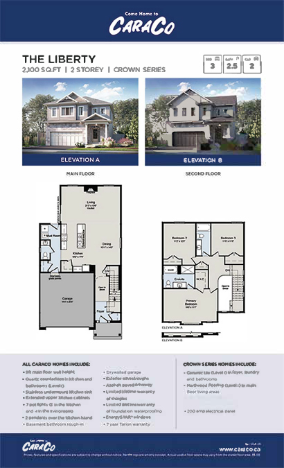 The Liberty, an open concept two storey featuring 2,100 sq/ft, 3 bedrooms and 2.5 baths. Bright living room/dining room adjacent to a spacious kitchen with walk-in pantry. Convenient main floor laundry and primary bedroom with walk-in closet and luxury 4-piece ensuite. A well thought-out two storey home with just the right amount of space; make it your own with one of two available craftsman inspired exterior facades.