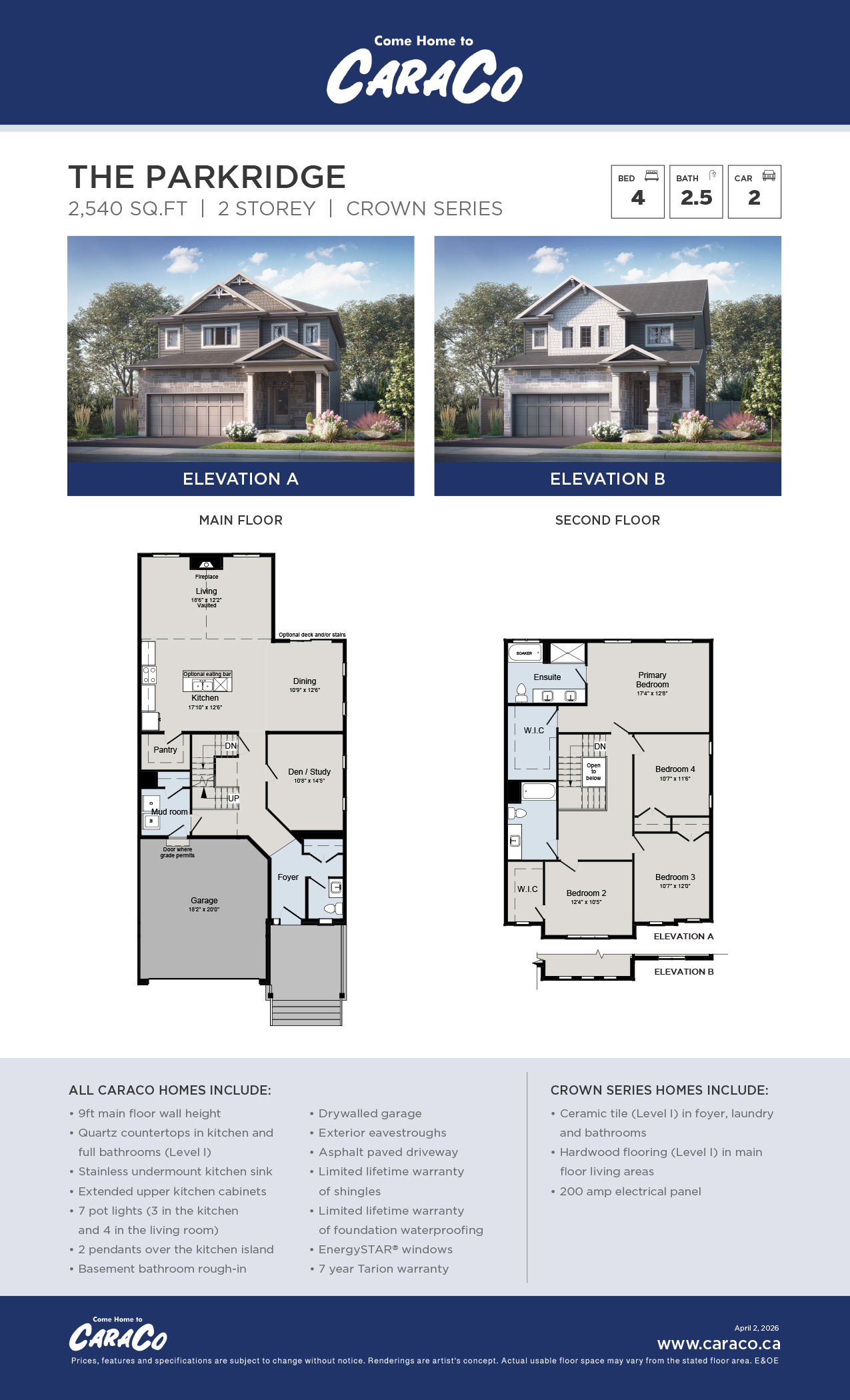 Download Brochure (1.15 MB)The Parkridge, an open concept two storey featuring 2,540 sq/ft, 4 bedrooms and 2.5 baths. Bright living room with vaulted ceiling plus large dining room and main floor den. A spacious kitchen with a large walk-in pantry. Convenient main floor laundry/mud room and primary bedroom with walk-in closet and luxury 4-piece ensuite. A well thought-out two storey home with just the right amount of space; make it your own with one of two available craftsman inspired exterior facades.