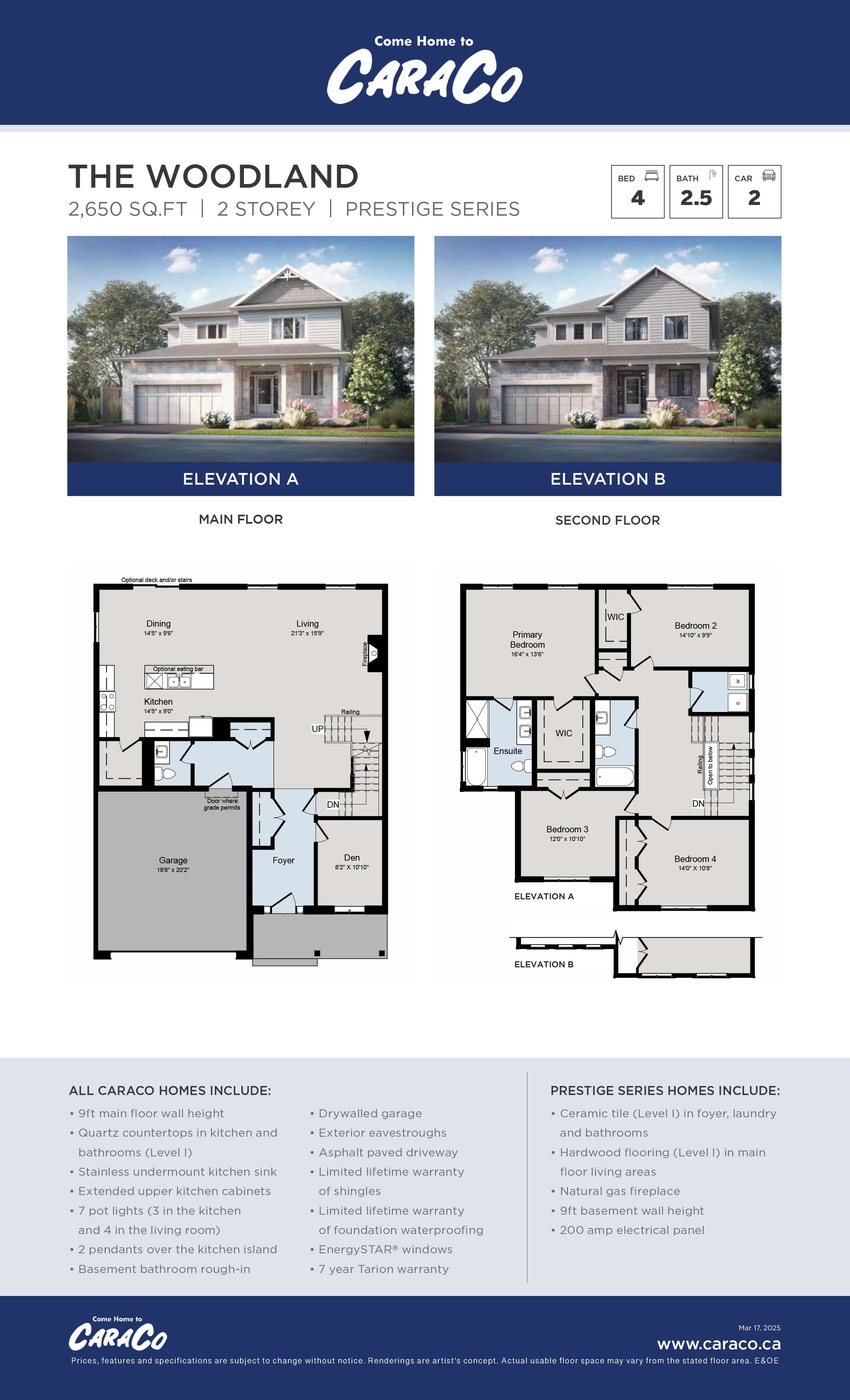 The Woodland, an open concept two storey home offering 2,650 sq/ft, 4 bedrooms and 2.5 baths. The main floor features a bright living room with gas fireplace, spacious kitchen with centre island, large walk-in pantry open to the dining room. The main floor also features a front office/den. The second floor offers 4 large bedrooms including the primary bedroom with oversized walk-in closet and luxury 5-piece ensuite complete with double sinks, tiled shower and separate tub plus convenient second floor laundry room. The Woodland from CaraCo, a well designed two storey home with just the right amount of space; make it your own with one of two available craftsman inspired exterior facades.